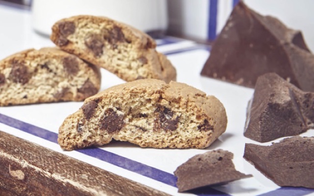 Hình dáng biscotti Ý truyền thống: dài, thanh mảnh, với bề mặt bánh nâu nhẹ, xen lẫn vân socola tự nhiên bắt mắt.